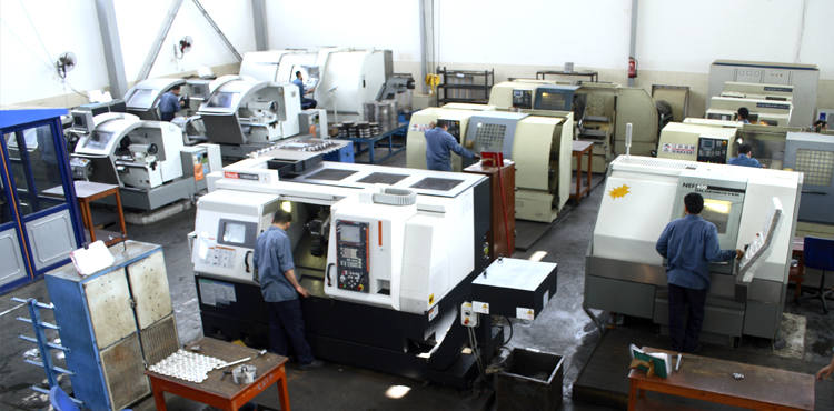 The work piece goes through different production stations with intermediate quality control between each two machining operation.